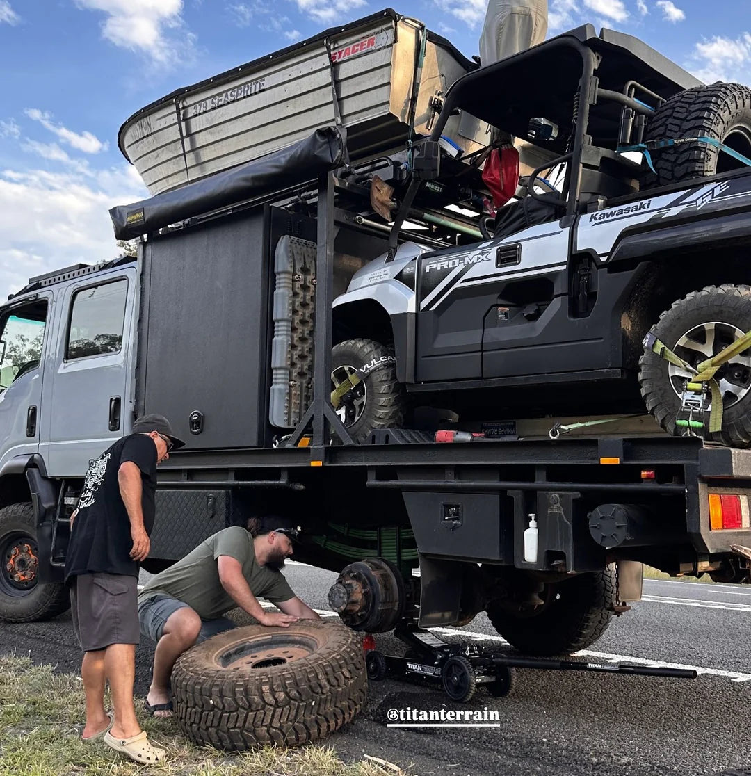 Whether it is mud, grass, sand, gravel or even your concrete garage floor, the Titan Terrain Jack doesn’t compromise on anything. Use it for your general maintenance, to clean your car, then throw it in the back and take it on your 4x4 trip or adventure.