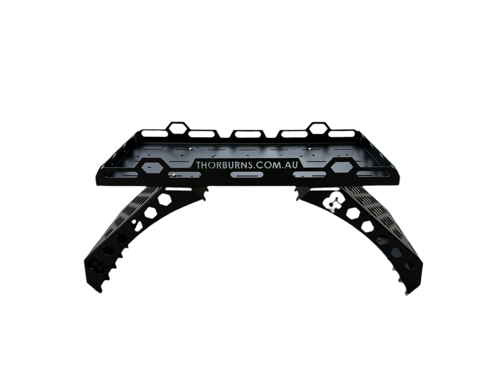 Made from 3mm Aluminium, this is the perfect way to gain some extra storage on the spare wheel of your rear bar or canopy. This shelf easily mounts to your tyre with two ratchet straps for a stable and handy platform to carry extras. Adjustable for different size wheels.